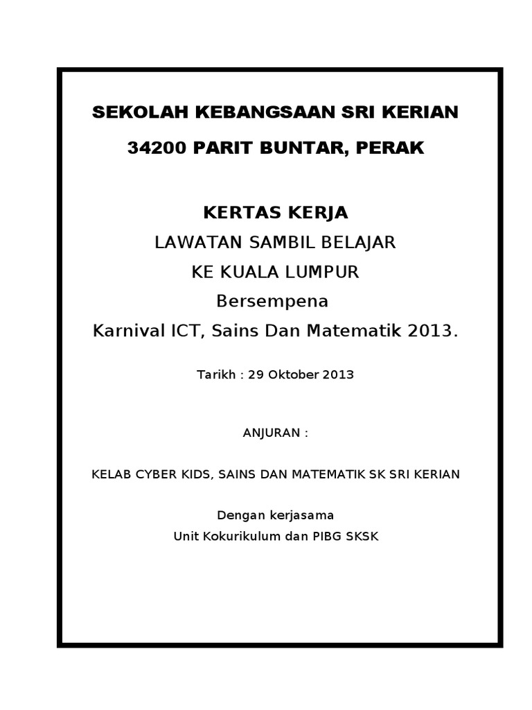 KERTAS KERJA PROGRAM LAWATAN SAMBIL BELAJAR Pengenalan Lawatan sambil belajar merupakan satu proses pembelajaran yang mana para pelajar akan dibawa melihat dan. Baca versi flipbook dari Kertas Kerja Lawatan Sambil Belajar. Muat turun halaman 1-30 di.